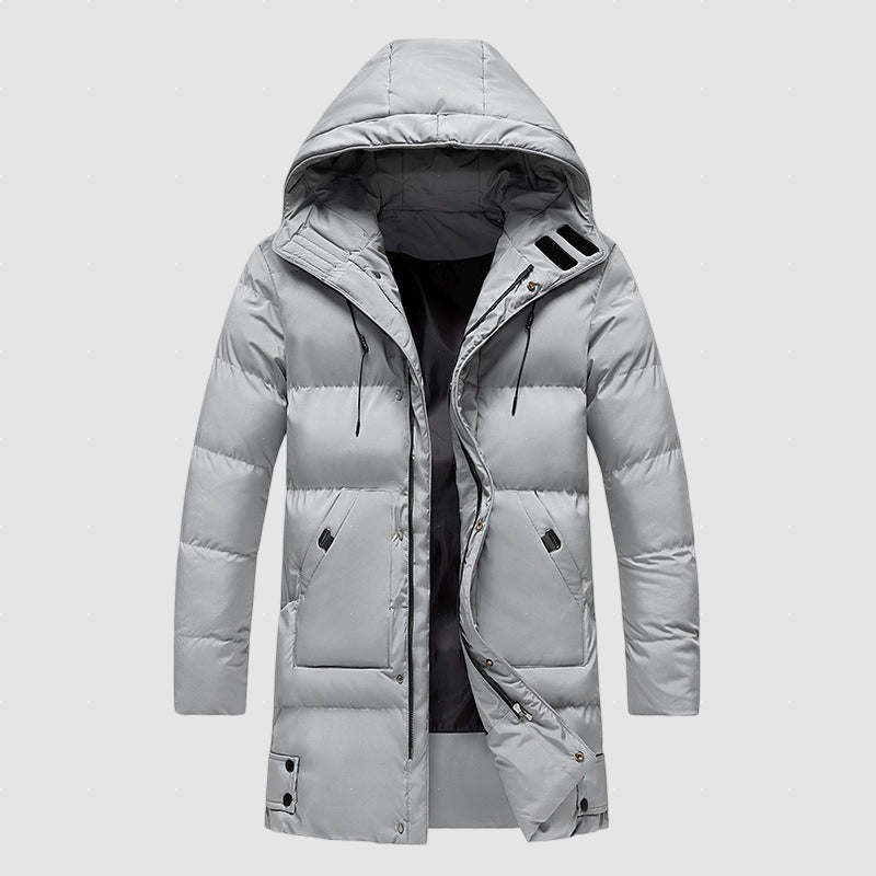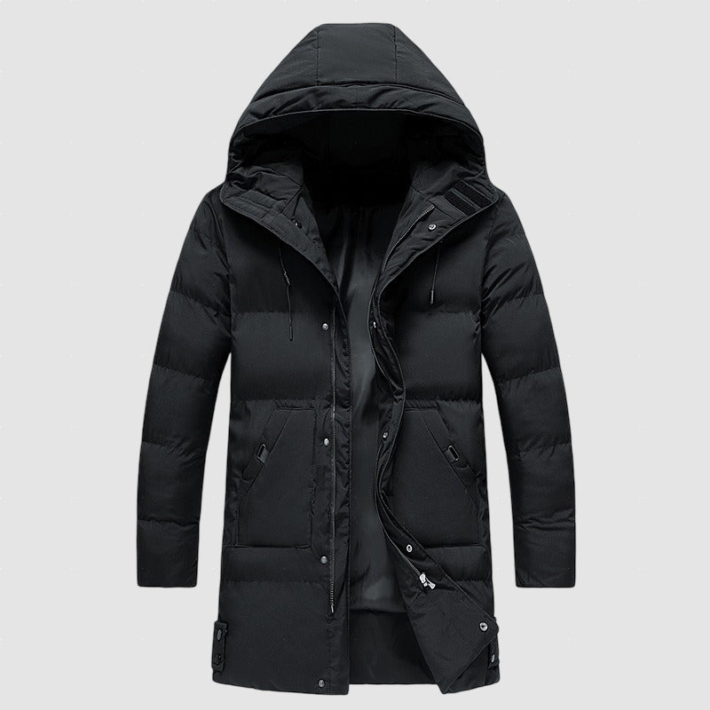 Dieser lange Herren-Winterparka wurde für kalte Tage entwickelt und verbindet angenehme Wärme mit einem klaren, modernen Look. Die isolierende Wattierung, der hohe Kragen und die Kapuze bieten zuverlässigen Schutz vor Kälte, während der bequeme Schnitt ideal für den Alltag und längere Aufenthalte im Freien ist.