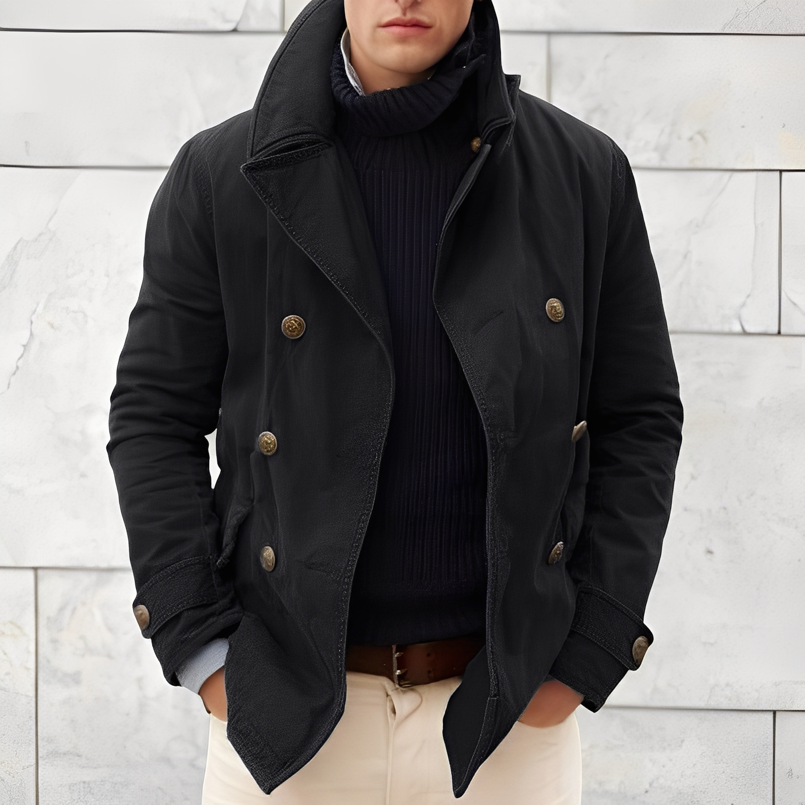 Diese Herren-Cabanjacke ist für die kommende Wintersaison konzipiert und verbindet klassisches Design mit funktionalem Tragekomfort. Das strukturierte Obermaterial bietet angenehme Wärme, während der doppelte Knopfverschluss und der hohe Kragen zusätzlichen Schutz bei kühleren Temperaturen bieten. Ideal für den Alltag, das Büro oder stilvolle Auftritte in der kalten Jahreszeit.
